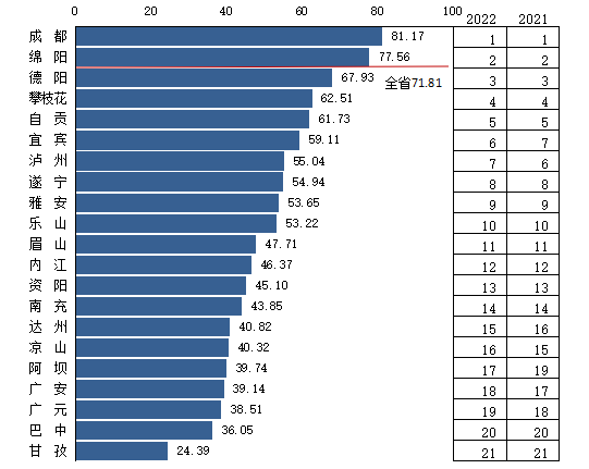 2022监测年度,成都在科技创新环境、高新技术产业化、科技促进经济社会发展等三个方面保持各市州首位,居科技活动投入和产出次席;绵阳居科技活动投入首位,在科技创新环境、高新技术产业化方面保持次位;攀枝花继续保持科技活动产出首位;德阳保持科技创新环境、科技活动投入第三位;资阳、乐山分别保持科技促进经济社会发展第二位和高新技术产业化第三位。