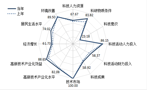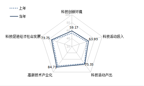 一级指标全面提升,短板改善成效突出。5项一级指标指数均较上年有不同程度提高。高新技术产业化板块保持一级指标首位,评价指数达到84.71%,比上年提高3.86个百分点,主要源于二级指标高新技术产业效益指数提高了6.93个百分点,其中,高新技术产业劳动生产率、利润率等效益指标有明显优化。科技活动产出、科技促进经济社会发展指数分别提高1.80和2.78个百分点,为75.35%和73.75%,仍处于70%—80%区间。